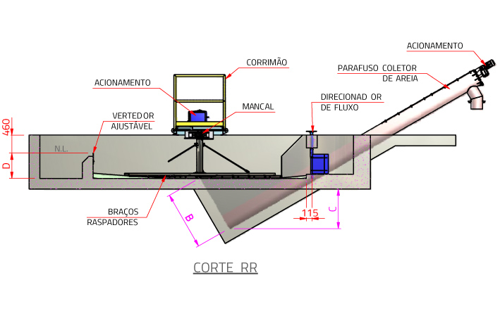 O tanque possui na sua seção de entrada defletores ajustáveis uniformemente espaçados que permite uma regulagem da distribuição do fluxo ao longo de toda regulagem da distribuição do fluxo ao longo de toda a largura da entrada. Na saída do desarenador está previsto um vertedor fixado ao concreto. O vertedor possui rasgos oblongos para ajuste vertical. Os defletores ajustáveis distribuem o escoamento uniformemente através de largura do tanque. A lâmina defletora é executada com chapa de aço carbono e é regulada manualmente do nível do piso de operação.