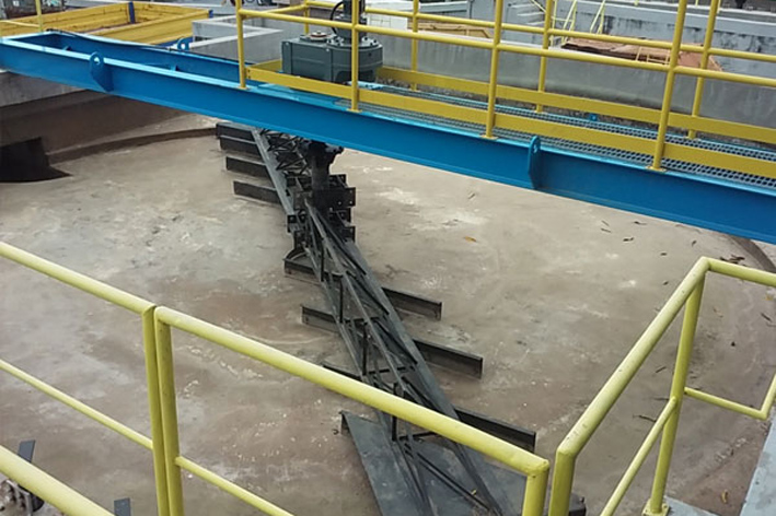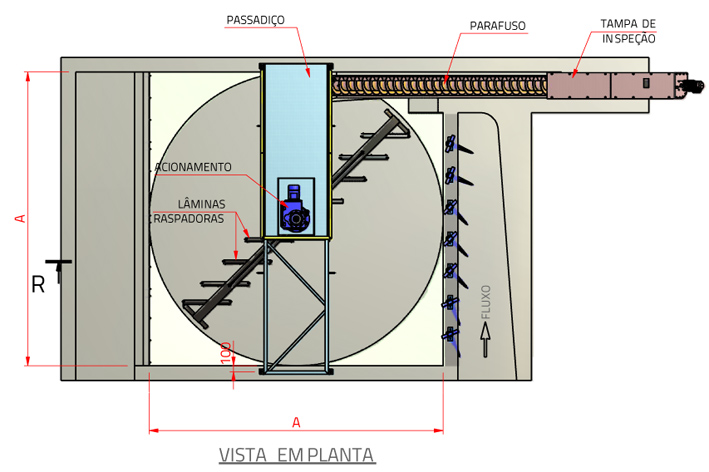 A caixa de areia tipo CS é aplicada em tanques quadrados, sendo o recolhimento da areia realizado por um raspador de fundo, com campo de ação circular que encaminhará a areia decantada para um poço de descarga, a partir de onde o mecanismo de lavagem de areia coletará o material.
