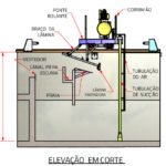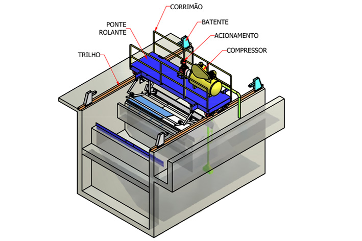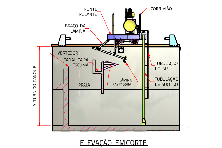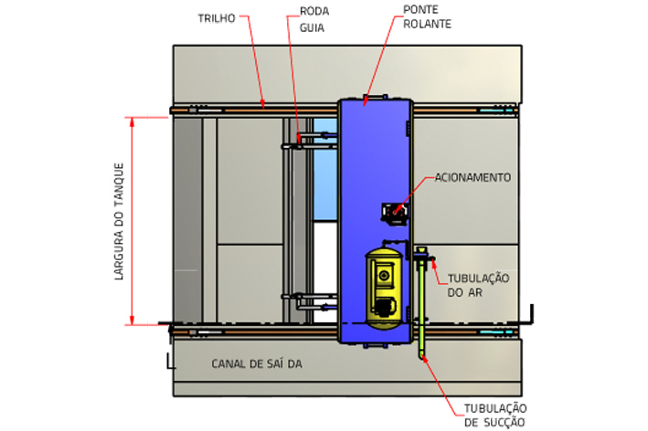 – Sistema Air Lift: A ponte será dotada de um tubo de sucção de areia fixado na parte inferior da estrutura e um tubo de injeção de ar, interno ao tubo de sucção, para a alimentação de ar no fundo do tanque. Um soprador de ar tipo Roots é instalado na ponte para o fornecimento de ar. O material sedimentado é conduzido pela tubulação de sucção até a canaleta de descarga localizada na lateral do tanque.