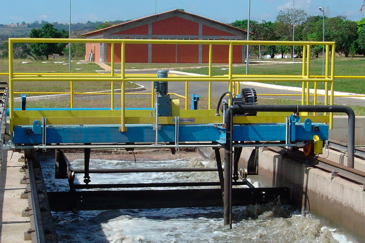 – Acionamentos: O acionamento localiza-se em uma das extremidades da ponte e é constituído por motorredutor com freio eletromagnético. O redutor de velocidade é do tipo de engrenagens helicoidais, eixos paralelos e possui eixo de saída oco montado no eixo das rodas motrizes. O raspador é acionado por motorredutor tipo engrenagens helicoidais, montado diretamente no eixo de translação, que transmitem às rodas tipo ferroviárias o movimento de translação. O braço raspador de superfície também é acionado por mecanismo automático de contra-peso e permite a retirada do material sobrenadante.