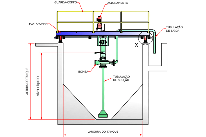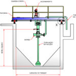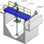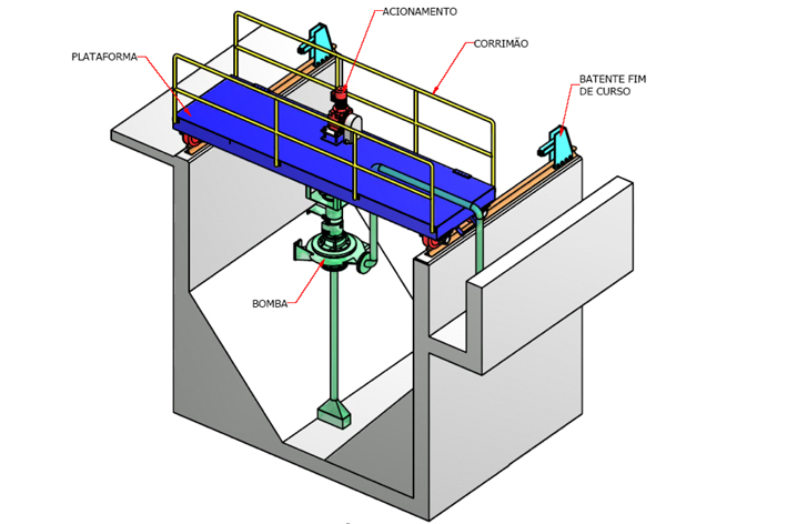 A caixa de areia tipo ponte rolante com bomba para tanques retangulares é constituída por uma bomba centrífuga de rotor recuado tipo “vortex” montada em uma ponte rolante fabricada em viga contínua ou treliçada.