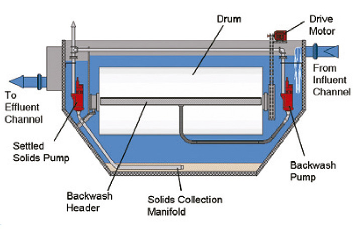 Neste equipamento, que apresenta filtração contínua sem interrupção durante a retrolavagem, o filtrado é recolhido dentro do tambor, depois descarregado através do eixo central ao canal de efluentes.
