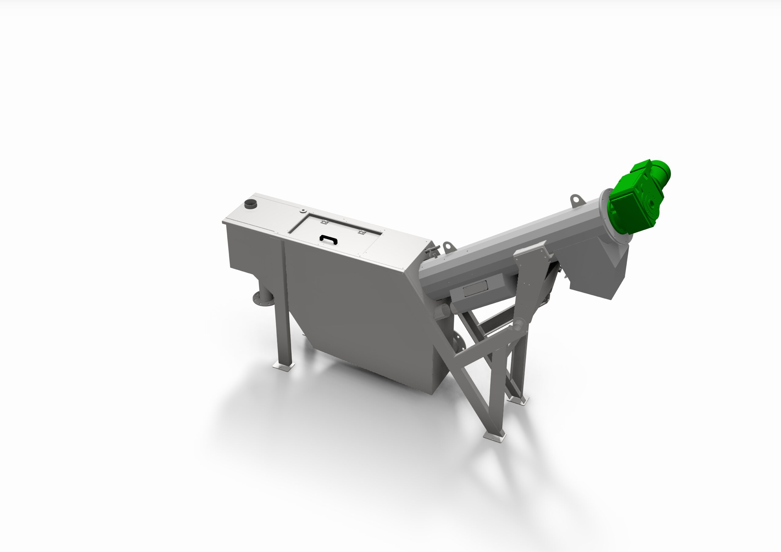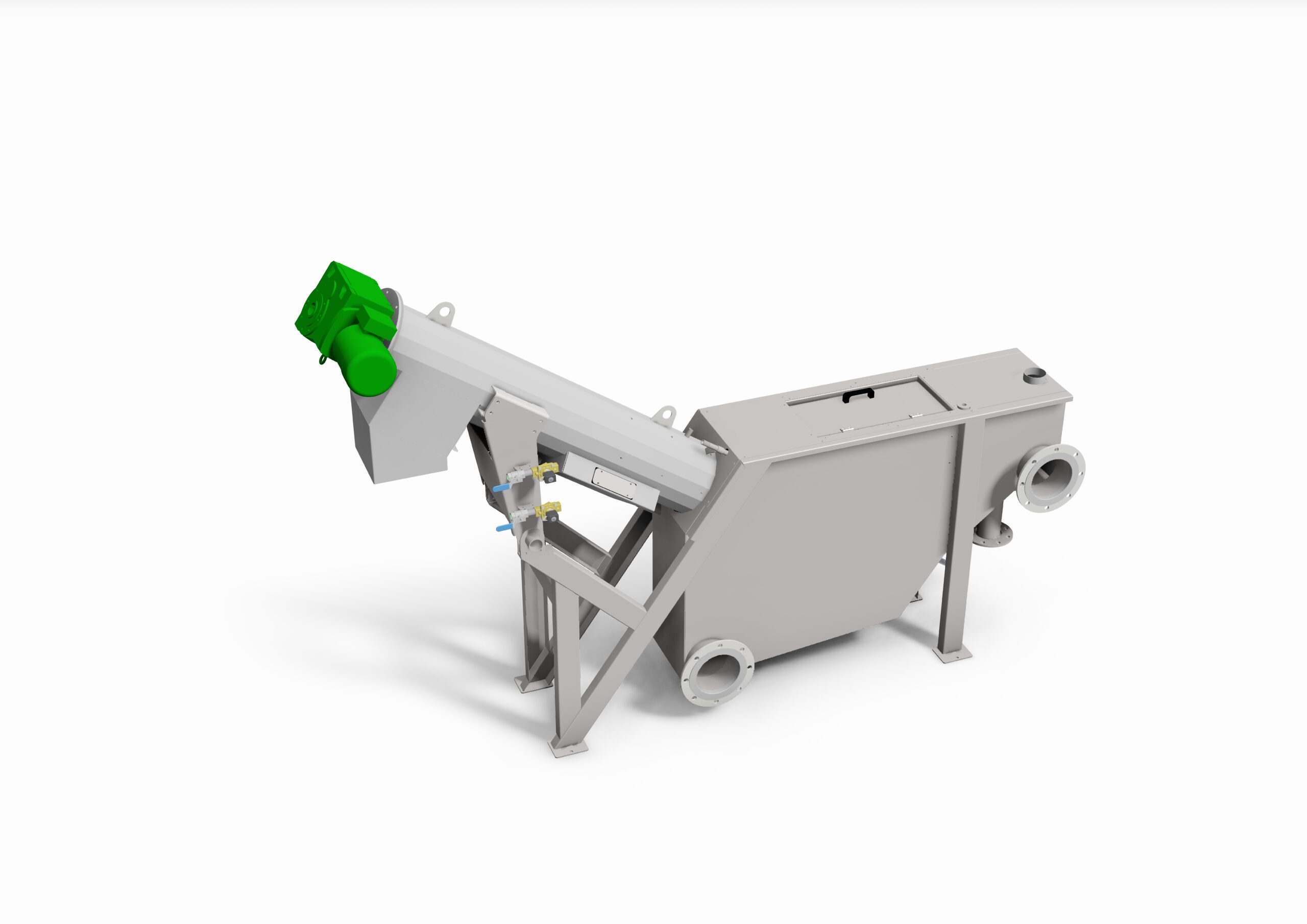 A peneira autoportante de parafuso modelo SS separa os sólidos (gradeados, lixo) da água, lava-os e desidrata-os. Uma espiral rotativa com uma escova periférica faz a limpeza do cesto filtrante.